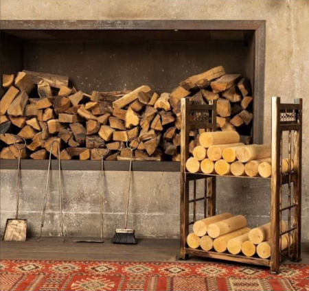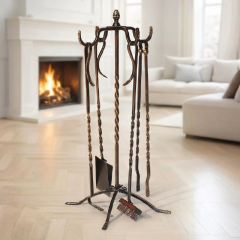 На боковых сторонах дровницы предусмотрены 4 крючка, на которых удобно размещаются 4 предмета: кочерга, совок, щетка и щипцы. Эти аксессуары поставляются в комплекте с дровницей, формируя единое стилистическое решение и обеспечивая максимальное удобство при эксплуатации.