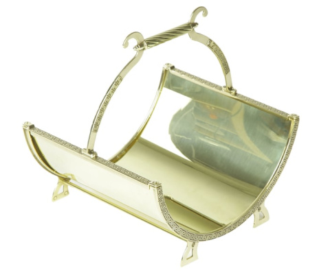 Дровница сделана из латуни в золотом цвете. Хотя напоминает и повидавшее виды золото. Ручка дровницы очень удобна, и ее можно использовать как переноску. небольшая, но стильная модель для украшения прикаминной зоны.