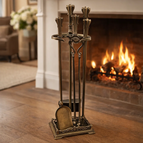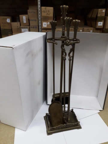 Каминный набор представляет собой полный комплект всех необходимых при уходе за домашним дровяным камином аксессуаров, устанавливаемых в специальную стойку. Каждый предмет снабжен длинной удобной ручкой сверху заканчивающейся фигурным окончанием. Снизу основания площадка с чеканным обрамлением, которая служит для сбора случайного мусора при пользовании аксессуарами.