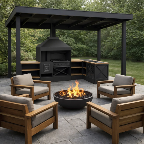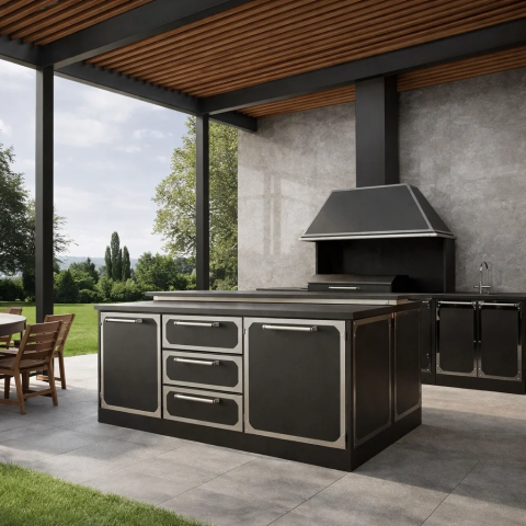 Мангальная зона из металла может стоять на улице и дома. Но для улицы нужен обязательно навес или беседка, если они у уже у вас есть, то сообщите менеджеру для них и рассчитаем. А если нет, может сделать ее тоже. А для дома важна хорошая вытяжная система, чтобы готовить можно было круглы год не открывая настежь окна.