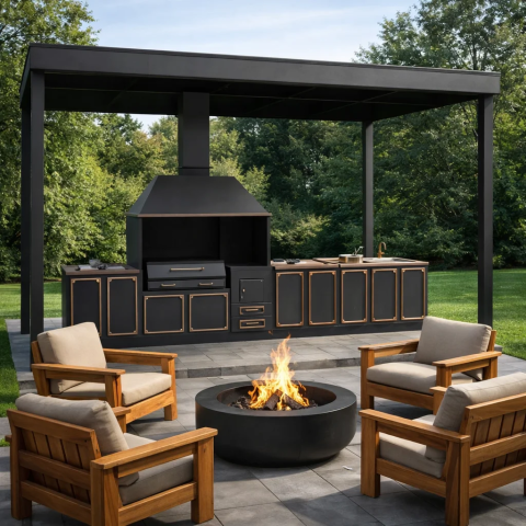 Общий размер указан по фасаду без учета вытяжного зонда, но может сделать его чуть меньше, если чуть-чуть не подходит по размеру. Или уменьшить шкафы, мангал. Убрать/добавить тумбы или изменить размер. Вытяжные зонды можем сделать других конструкций, с ковкой и т.д.