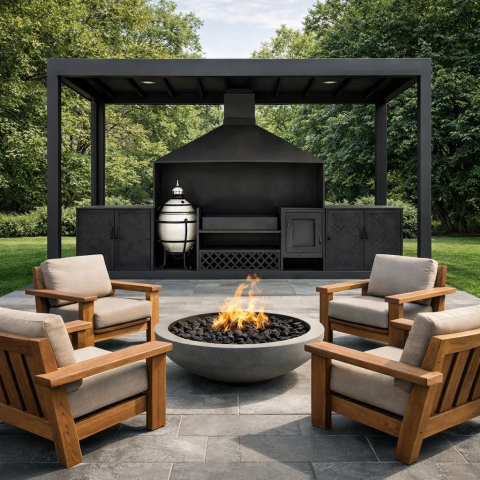 По желанию уличная кухня комплектовать : Мойкой со смесителем/без. Столешница может быть: лиственница, кварцевый агломерат, нержавейка, искусственный камень, пластик HPL. А так же столом, шкафом коптильней.