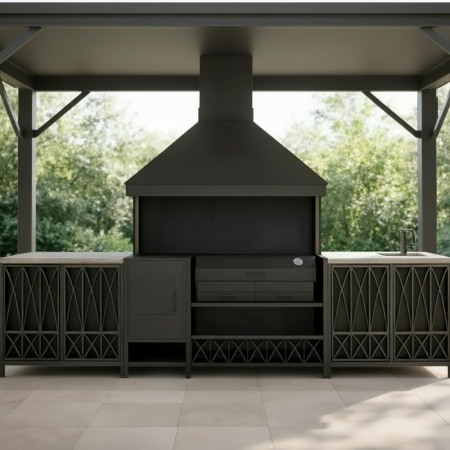 Модульная мангальная зона лофт из металла для дома, дачи(мангальный комплекс 28) с холодной ковкой. Используем только качественный металл, все швы зачищаются идеально. Сверху поверхностная обработка металла пескоструем, аникоррозийное покрытие и финишное лако-красочное покрытие. Дерево также обработано антисептиком и лаком. Дерево на выбор. В этом варианте для столешниц использована лиственница. Цвет дерева тоже можем изменить.